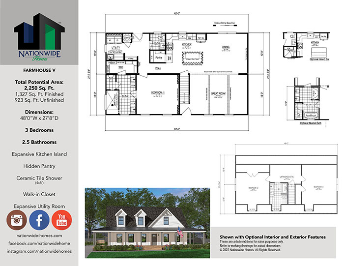 The Farmhouse V design features a total first floor living area of 1,327 square feet with 1 bedroom and 1-1/2 bathrooms. Optional completion of the 923 square feet second floor provides a total of 3 bedrooms and 2-1/2 baths for a total of 2,250 square feet of living space.