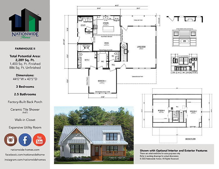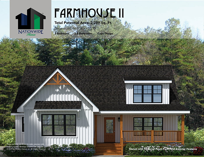 The Farmhouse II cape design features a total potential living area of 2,289 square feet with 3 bedrooms and 2-1/2 bathrooms.