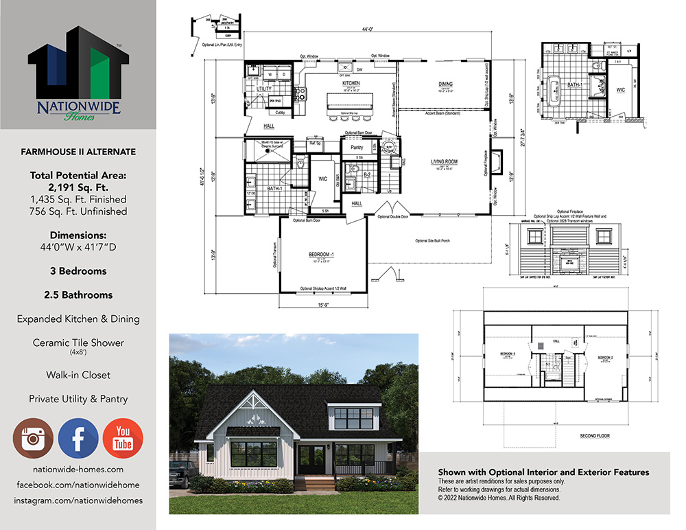 The Farmhouse II - Alternate design features a total potential living area of 2,191 square feet with 3 bedrooms and 2-1/2 bathrooms.
