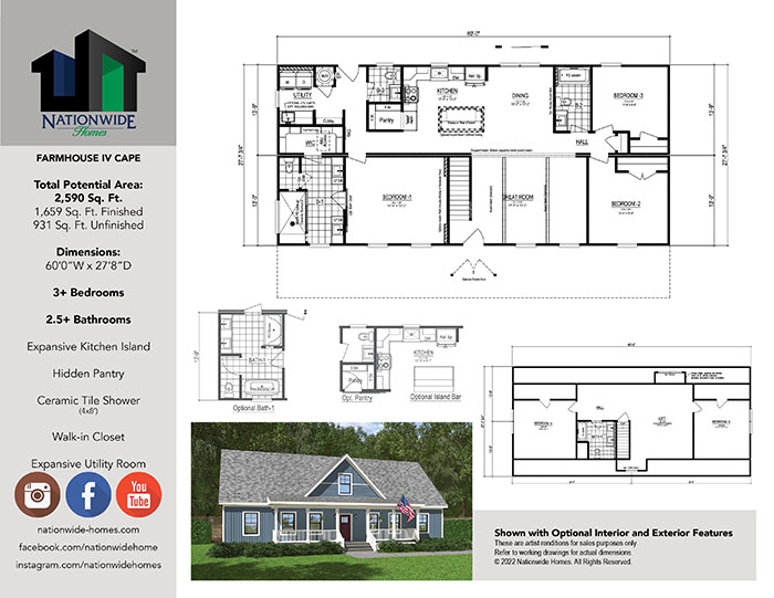 Highlights of the Farmhouse IV Cape include an expansive kitchen island, hidden pantry, 4'x8' ceramic tile shower, a walk-in closet, and expansive utility room.
