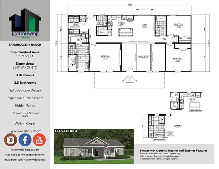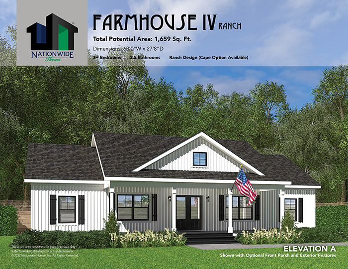 The Farmhouse IV Ranch design features a total finished living area of 1,659 square feet with 3 bedrooms and 2-1/2 bathrooms.
